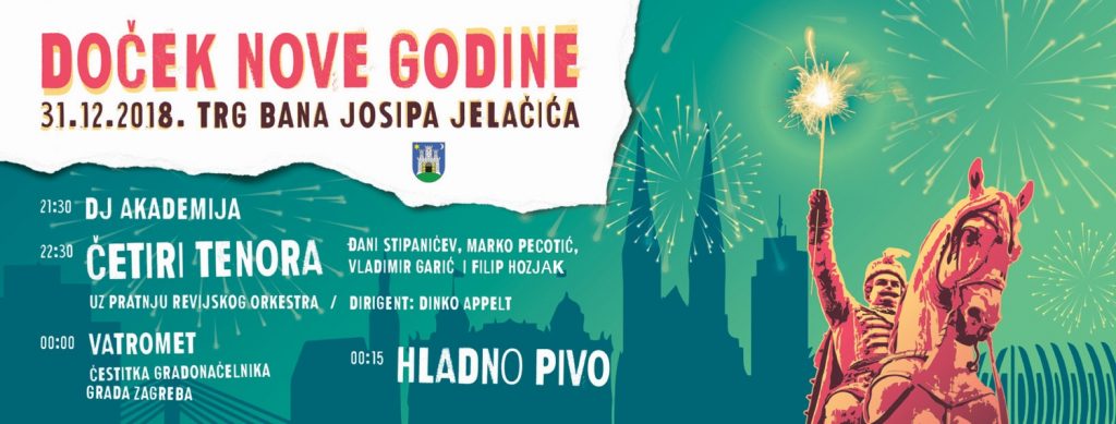Okupljene građane i goste glavnog hrvatskog grada u Novu će godinu uvesti DJ, Četiri tenora uz pratnju Revijskog orkestra te dečki iz Gajnica – bend Hladno pivo.